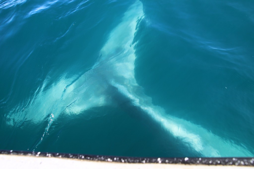 L’un des baleineaux souffre d’albinisme et n’est donc pas noir avec des taches blanches comme les autres baleines mais blanc. Il est aussi très curieux et joueur ; il passe et repasse sans cesse sous le bateau et semble nous observer.
