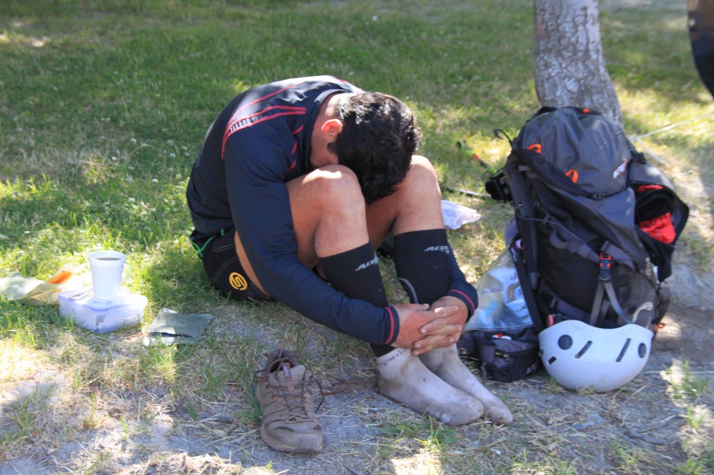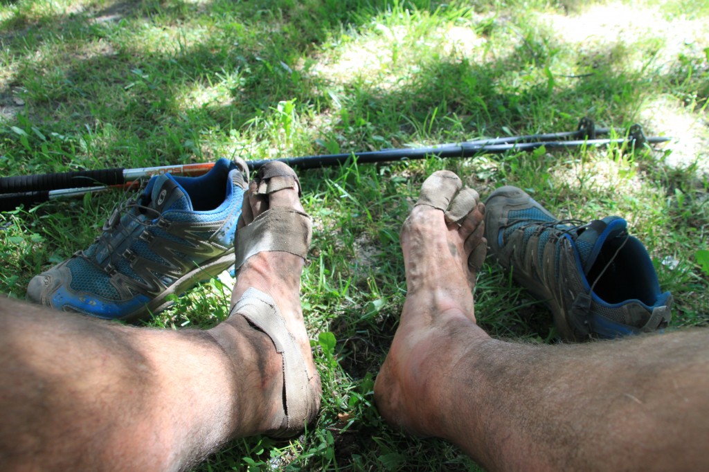 Après l’agitation de l’arrivée, il s’assoit à son tour dans l’herbe, à l’ombre et me raconte en ôtant ses chaussures poussiéreuses comment après plus de 38h de course il a été obligé de dormir un peu car il avait des hallucinations dans la forêt ; comment il a dû dormir avec ses baskets qu’il ne pouvait enlever sous peine de ne pouvoir les remettre ; comment la douleur au niveau de son talon droit a commencé à le tirailler dès le 90ème kilomètre, et a augmenté au cours des 76 kilomètres qui ont suivi… Son pied droit a doublé de volume et de grosses ampoules parsèment la peau de ses orteils et de ses pieds. Mais il est heureux, fatigué mais heureux.