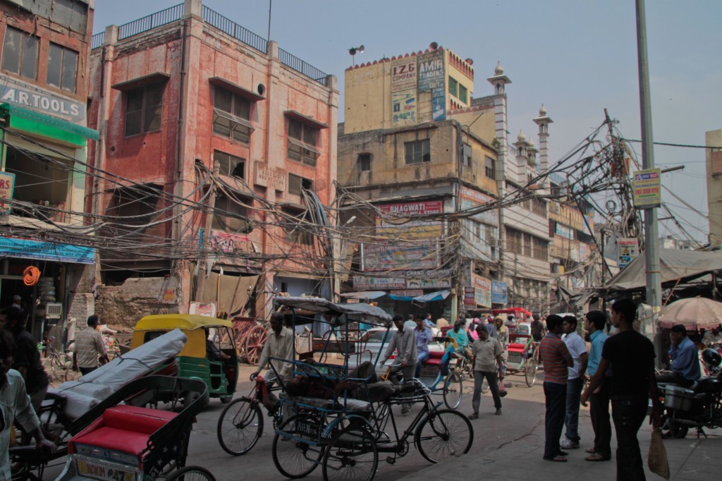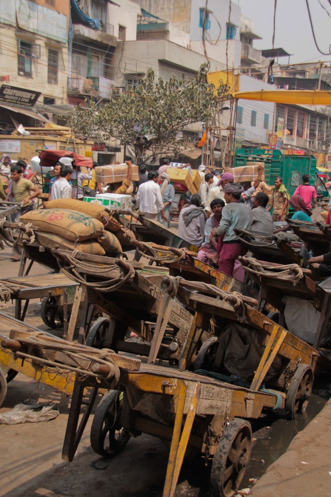 Nous partons ensuite nous promener dans Old Delhi. Et là tout est multiplié. La foule, dense et compacte, les couleurs, les odeurs… comme dit Hervé « ça brasse sévère !! ». Les rues qu’on emprunte sont littéralement noires de monde. Les véhicules, qu’ils soient motorisés ou non, peinent à se croiser et des embouteillages colossaux se forment ; les klaxons et les gens hurlent. Dans cette anarchie où les sens sont mis à rudes épreuves, Hervé et moi n’arrivons pas à nous parler. Nous avons besoin de toute notre concentration pour voir, entendre, sentir et essayer de comprendre ce qu’on perçoit.