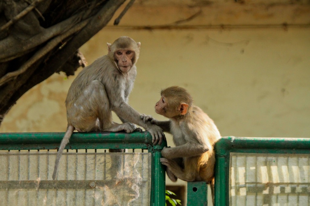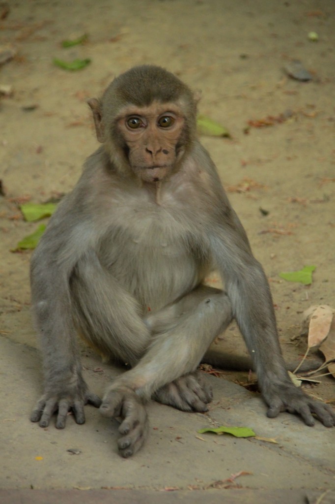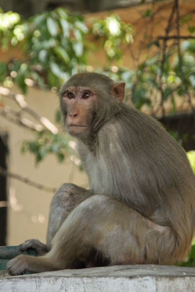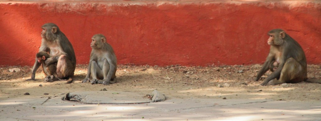 Pour aller ensuite vers la maison du Sikkim, située dans le quartier des ambassades, on hésite à prendre un rickshaw car il fait vraiment chaud et qu’on commence à en avoir plein les pattes. Finalement on continue quand même à pied. En entrant dans une des grandes rues qui s’approche de ce quartier surveillé on trouve un singe assis sur un monticule de terre. On l’observe longuement, ce qui fait bien marrer les 2 militaires qui montent la garde derrière nous. On continue d’avancer dans cette rue et là on comprend mieux pourquoi ça les faisait rire. Des singes, il y en a partout…