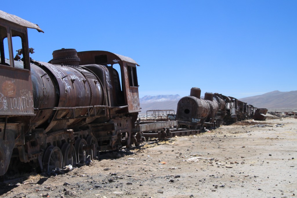 Notre premier arrêt de la journée est le cimetière ferroviaire, à quelques km d’Uyuni. Là, dans un décor de fin du monde, de nombreuses locomotives rouillées, vestiges de l’âge d’or du train à vapeur, attendent au bout d’une voie délaissée un départ qui ne viendra plus.