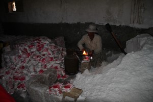 Ce qui nous semble un paradis est pourtant bien un enfer pour les hommes qui travaillent (à coups de pioches et de pelles) pour dégager des briquettes de sel non iodé et qui sont payés une misère (moins de 10 bolivianos, soit moins de 1 euro la tonne de sel) sous les brûlures du soleil et du sel qui ronge la peau.
