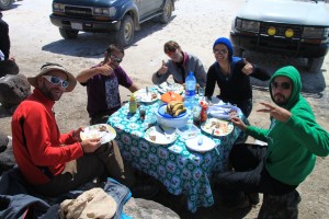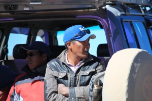 A table, nous nous réchauffons aussi avec du vin, l’humeur est détendue et joviale (l’espace d’une soirée je me suis sentie bilingue, je n’avais jamais si bien parlé espagnol…), tant et si bien que le lendemain, Hervé et moi n’entendons pas le réveil qui aurait dû nous tirer du lit à 4h45. A 5 heures, on tambourine à la porte, nous devons faire nos sacs et sauter dans le 4×4 en catastrophe.