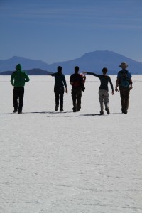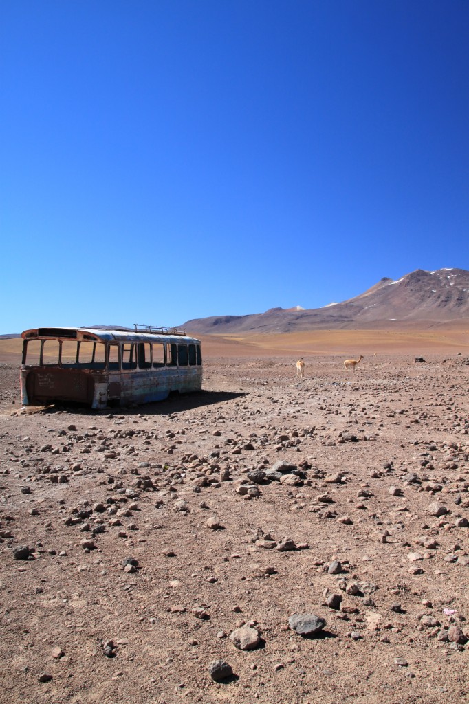 La dernière étape a donc lieu à 9h à la frontière, où après nos avoir fait nos adieux, nous reprenons la piste pour de longues heures en direction d’Uyuni. Enfin, c’était ce que nous pensions être la dernière étape. Car sur la route, à près d’une heure et demie d’Uyuni nous tombons en panne… au milieu de nulle part. Notre guide et chauffeur semble s’y connaitre à peu près autant que moi en mécanique. Il réquisitionne toutes les bouteilles d’eau pour remplir le réservoir du radiateur et tous les autres 4×4 s’arrêtent, chacun y allant de son conseil ou de son pronostic. Finalement un des autres 4×4 nous tracte grâce à un câble d’acier mais il va assez vite, et dans le véhicule on ne fait pas trop les malins et on attache nos ceintures. Au bout de quelques kilomètres, le guide réessaye de démarrer et la voiture repart. On réussira finalement à rentrer à Uyuni par l’opération d’on ne sait quelle entité divine.