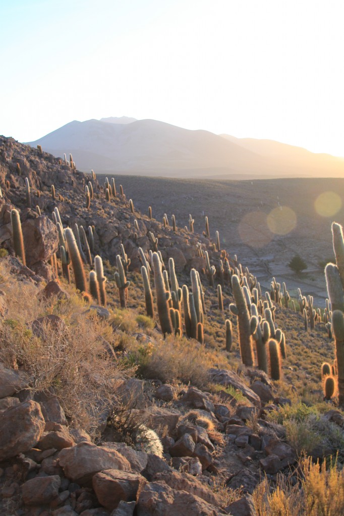 Malgré un vent fort qui nous glace rapidement, c’est un très grand plaisir pour les yeux de voir les couleurs changer sur le Salar à l’horizon, et les cactus autour de nous se parer de teintes dorées et scintillantes. On se sent privilégié et on se sourit bêtement, émus de partager ces moments qui nous font sentir intimes, alors qu’hier on ne se connaissait pas…