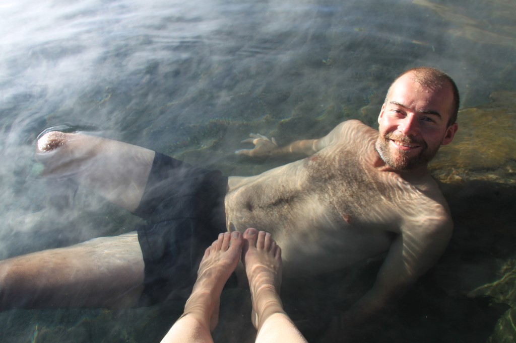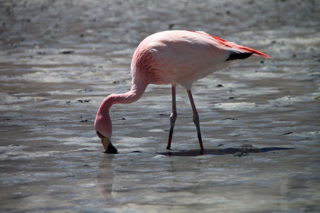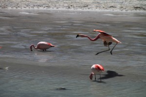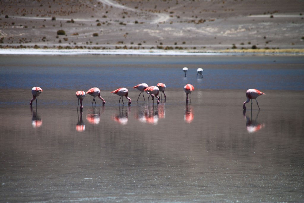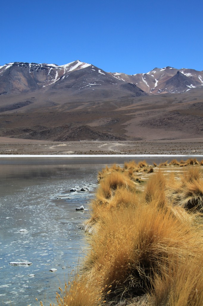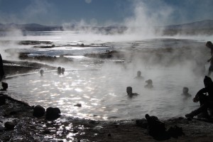 Nous partons ensuite prendre notre petit déjeuner (debout contre le 4×4) au Salar de Chalviri, où se trouve une piscine dont les eaux sont à 37°C. Si Hervé a eu le courage de se déshabiller pour se baigner, je n’ai pu qu’y mettre mes pieds frigorifiés (et instantanément réchauffés).