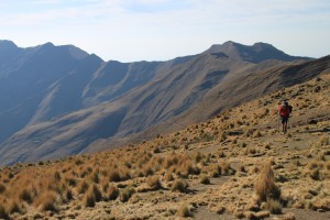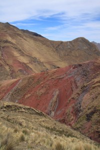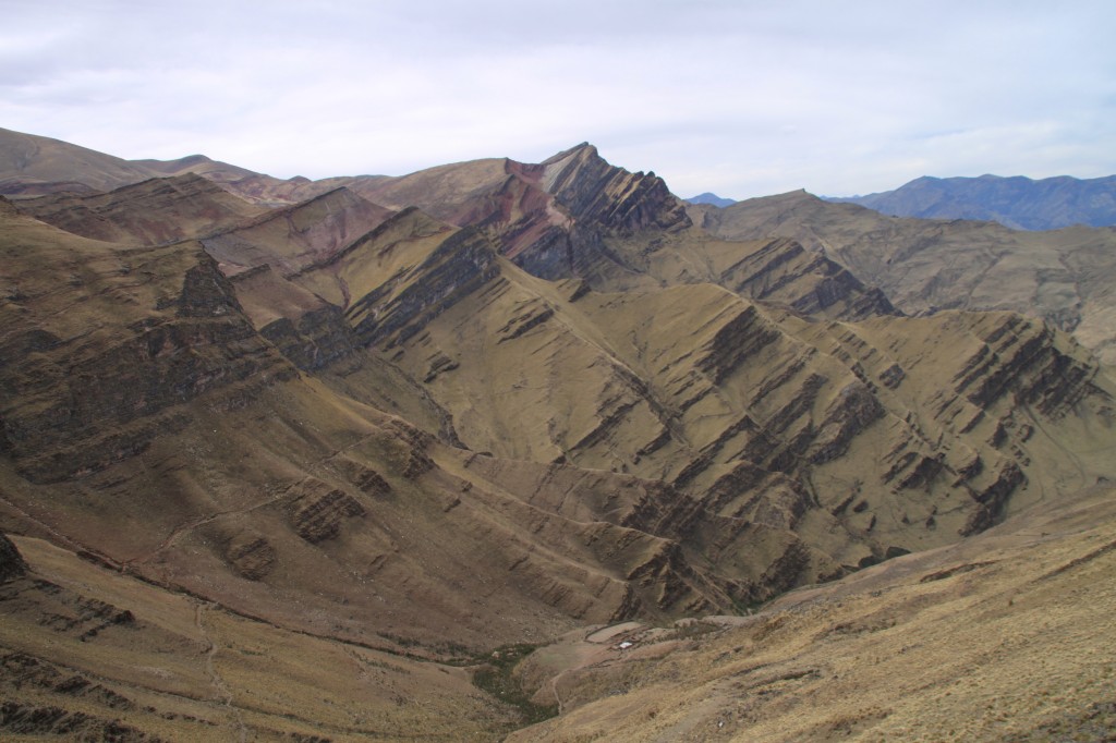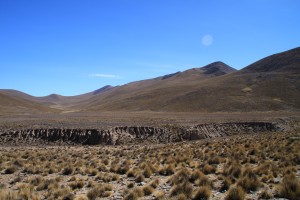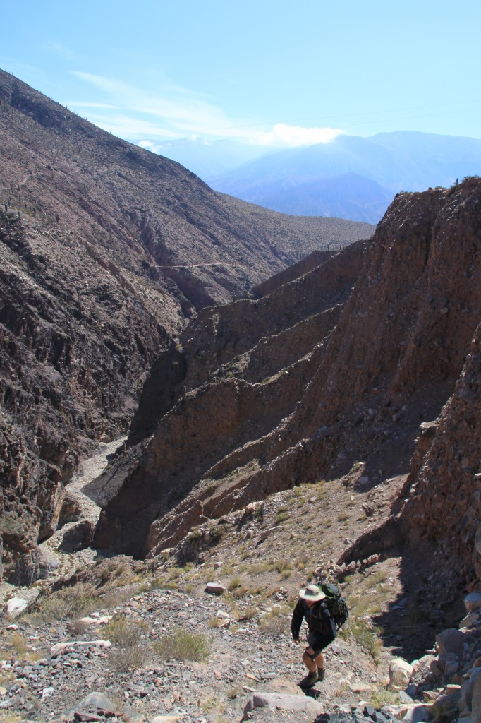 La première partie de la journée consiste d’abord à passer le col à 4200m, guère au-dessus de là où nous avons dormi, et on admire de nombreux rapaces, dont un condor, puis il faudra descendre pendant de nombreux kilomètres jusqu’au fond de la vallée. Au bout de près de 4h de marche (où nous ne croisons ni voyons personne) nous nous arrêtons pour faire cuire du riz à la sauce tomate (beurk, ce n’est pas super) au bord d’un torrent. Au fond de la vallée, nous croisons notre dernier point d’eau. Puis il faut reprendre la montée sur un sentier à flanc de montagne pendant plus de 2h, au bout desquelles nous espérons trouver le village de Molulo. Les paysages de montagnes et de vallées qui nous entourent sont spectaculaires.
