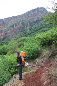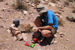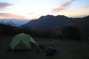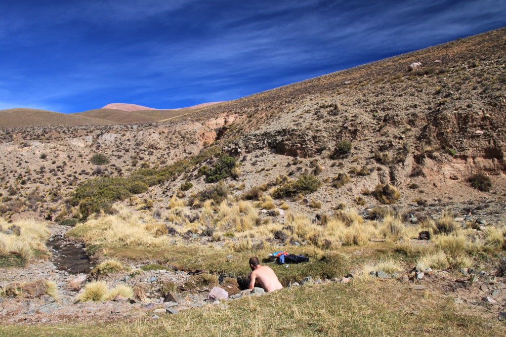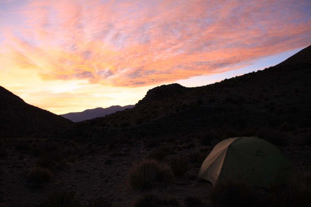 Un taxi nous emmène d’abord depuis Tilcara jusqu’à Alfarcito qui sera notre point de départ. Nous montons tranquillement, il fait très chaud et nous sommes très chargés. Nous avons de l’eau pour la journée et de la nourriture pour 5 jours et comme n’avons pas pu trouver de noodles ou autres mets légers et rapides à cuisiner nous sommes partis avec des pâtes, du riz et quelques sauces, ce qui augmente très vite le poids des sacs. Hervé porte environ 25kg et moi 15. Nous dépassons la Casa Colorada et la pente se fait plus raide. Nous nous arrêtons pour manger vers midi mais il n’y a pas la moindre trace d’ombre. Puis nous repartons et grimpons. Dans la montée, nous croisons un monsieur et sa fille qui nous donnent des indications sur le chemin à suivre et nous préviennent qu’il fera froid. Lui porte sur son dos une peau tannée de Puma, enroulée, et dont la tête bien que sans vie reste très expressive. Il l’a tué parait-il car la bête mangeait ses chèvres ; il en semble très fier.  Vers 16h ou 17h nous plantons la tente près d’un ruisseau. L’endroit est magnifique et encore une fois nous sommes seuls au monde. On se lave dans le ruisseau et on mange devant un coucher de soleil fabuleux.