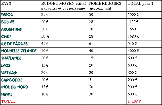 Et aussi une estimation de nos frais sur place grâce aux infos glanées sur les différents sites et blogs des voyageurs :